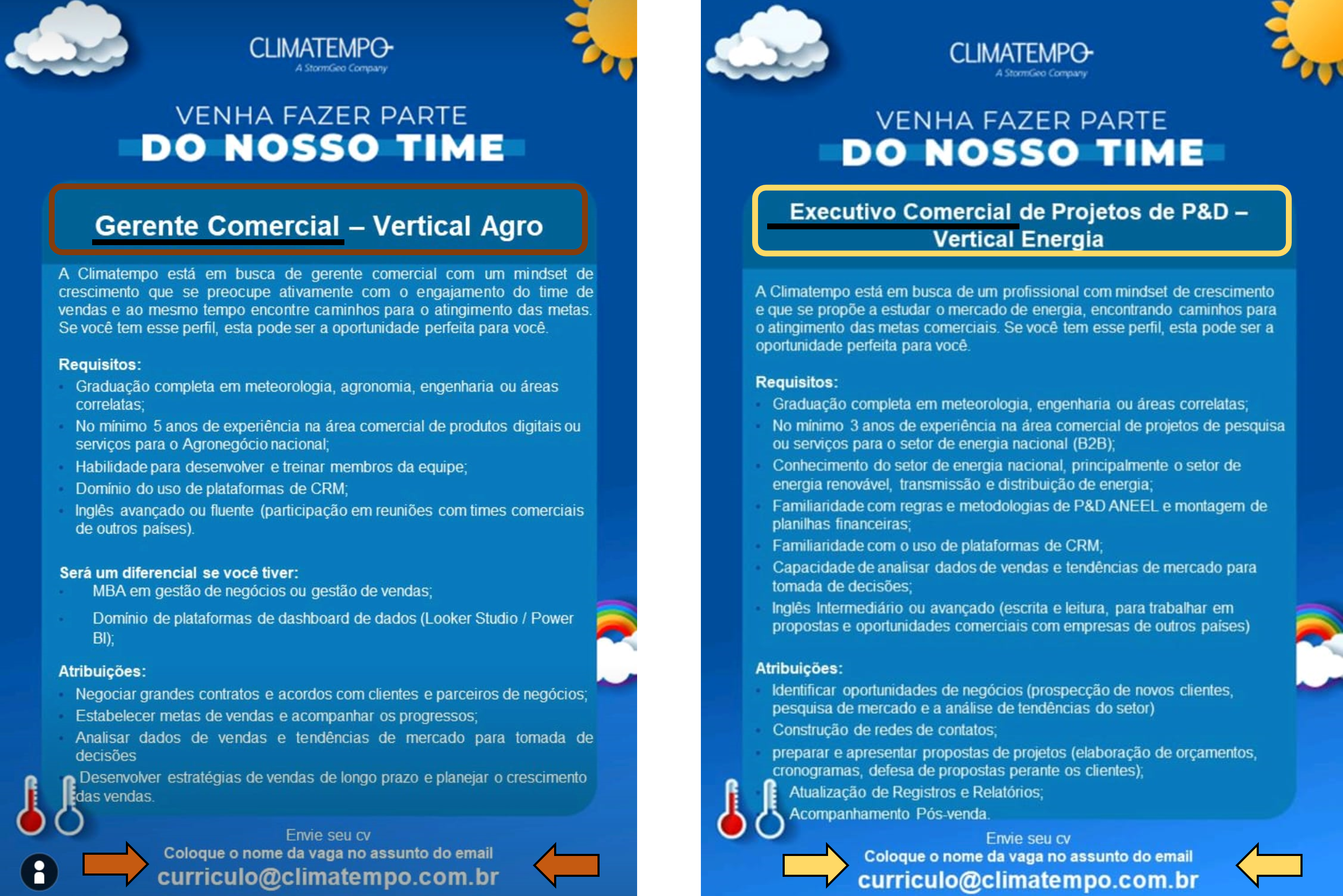 Há duas oportunidades de emprego para trabalhar na climatempo, a maior empresa de meteorologia da América Latina. As vagas são para: