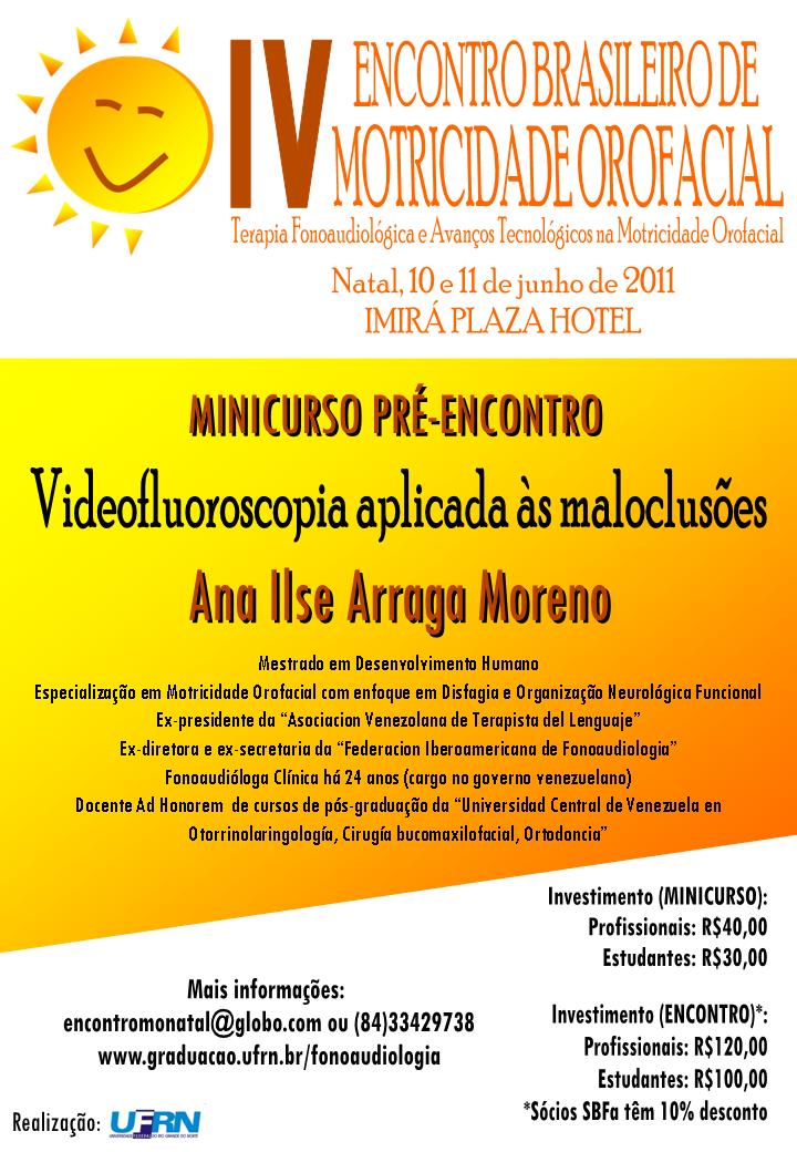 - No dia 10, haverá um minicurso pré-encontro sobre "Videofluoroscopia aplicada às maloclusões", a ser ministrado pela fonoaudióloga venezuelana Ana Ilse Arraga Moreno, com vagas limitadas! (divulgação em anexo). O minicurso acontece no horário de 14:00 às 18:00hs.